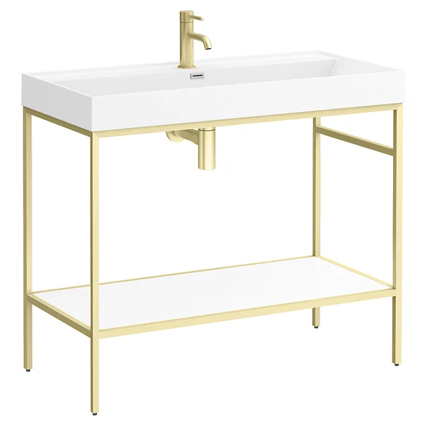 Arezzo 1000 Brushed Brass Framed Washstand with Gloss White Open Shelf and Basin