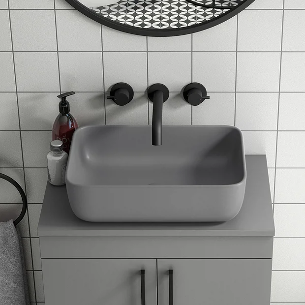 The eye catching luxury Arezzo matt grey coloured counter top basin has a stylish contemporary curved shape, perfect for creating a boutique feel in your bathroom. Designed to be mounted onto a worktop console and is best complemented with a high rise basin mixer or wall mounted tap. Manufactured from high quality vitreous china with a matt grey finish. Some small dimensional variation may occur due to manufacturing tolerances. Waste not included.