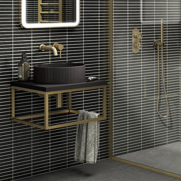 The smart space-saving Arezzo 500mm wide stone resin matt black wall hung countertop basin shelf features minimalist clean lines. Supplied with a supporting brushed brass steel towel rail frame, perfect for creating a stunning, fashionable, and chic bathroom interior. The practical square frame provides a space to hang your towel, keeping it close to hand. Complete the look with one of our stylish countertop basins, brushed brass basin taps and exposed bottle traps (not included).