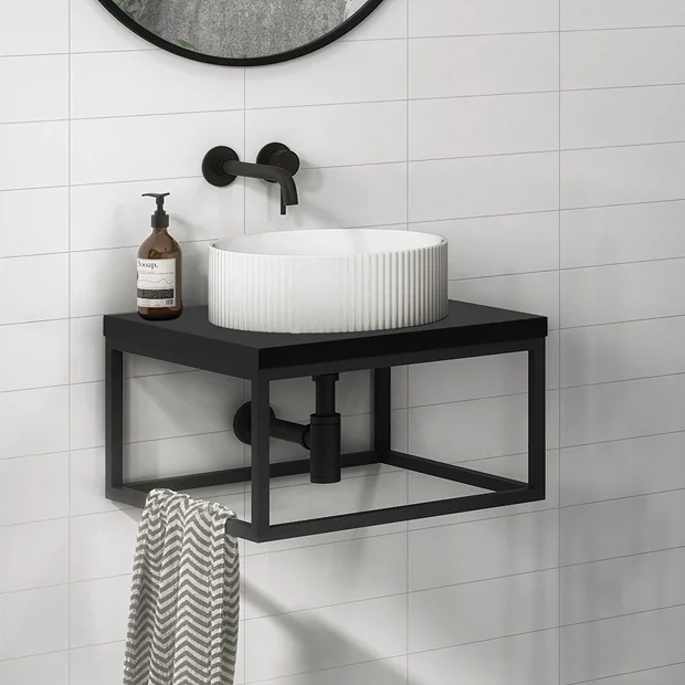 The smart space-saving Arezzo 500mm wide stone resin matt black wall hung counter top basin shelf features minimalist clean lines. Supplied with a supporting matt black steel towel rail frame, perfect for creating a stunning, fashionable and chic bathroom interior. The practical square frame provides a space to hang your towel, keeping it close to hand. Complete the look with one of our stylish counter top basins, matt black basin taps and exposed bottle traps (not included).