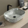 The eye catching luxury Arezzo matt black marble effect counter top basin has a stylish contemporary curved oval shape, perfect for creating a boutique feel in your bathroom. Designed to be mounted onto a worktop console and is best complemented with a high rise basin mixer or wall mounted tap. Manufactured from high quality vitreous china with a painted black marble effect finish. Some small dimensional variation may occur due to manufacturing tolerances. Waste not included.