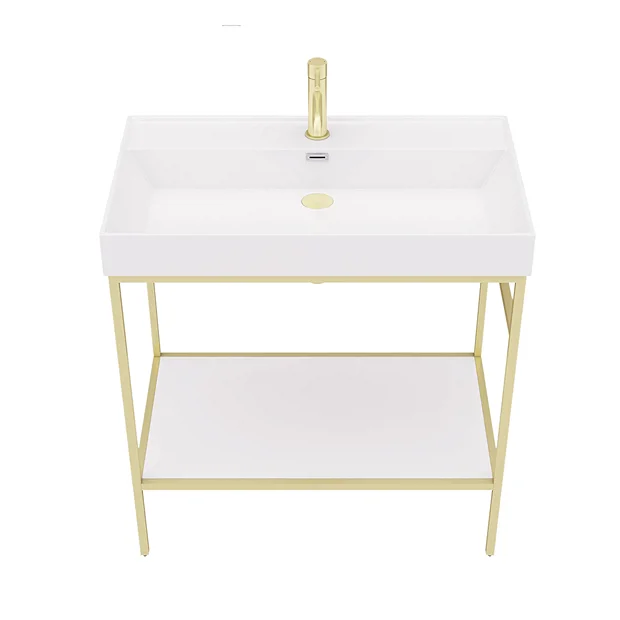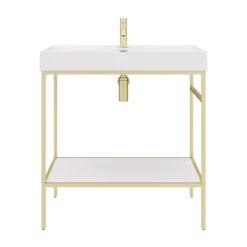 Arezzo 800 Brushed Brass Framed Washstand with Gloss White Open Shelf and Basin