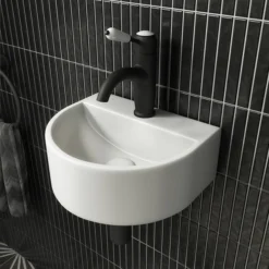 The stylish Arezzo round wall hung cloakroom basin, a high quality curved ceramic basin with a single tap hole and stunning matt white finish. Provides you with a handy wall mounted space-saving solution for your cloakroom or en-suite. Some small dimensional variations may occur due to manufacturing tolerances. Waste not included. Complete the look with one of our stunning exposed bottle traps.