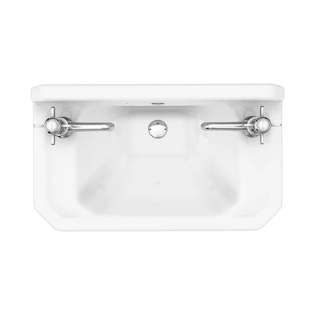 A high-quality traditional 2 tap hole wall mounted cloakroom basin with chrome wash stand, ideal for creating a period look in your bathroom or Cloakroom. Manufactured using high-grade materials ensuring a quality finish and long lasting durability.