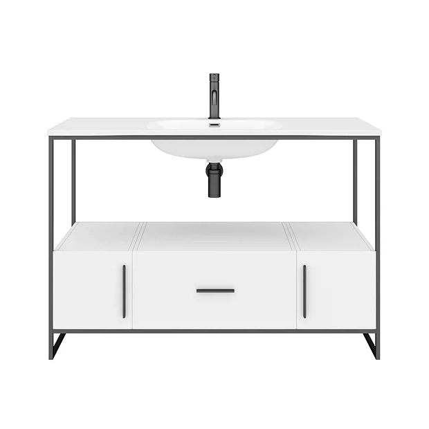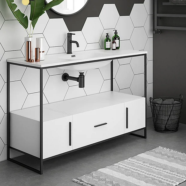 If you want to make a statement with your bathroom design, then choose the contemporary large Venice 1200mm wide free standing 1-drawer, 2-cupboard washstand. Features a designer spacious stone resin basin with a stunning matt white finish to complement the matt black washstand. This elegant minimalist washstand would look great with one of our modern matt black basin taps and bottle traps (sold separately).